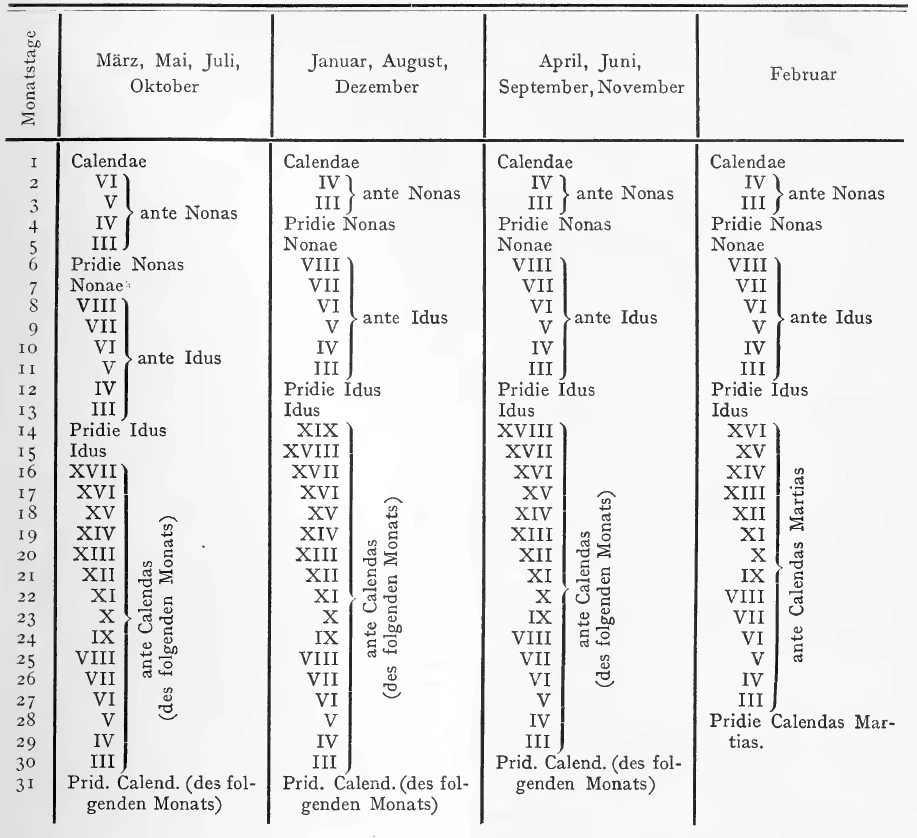Bei der altrömischen Datierungsweise haben in jedem Monat 3 Tage einen bestimmten Namen: